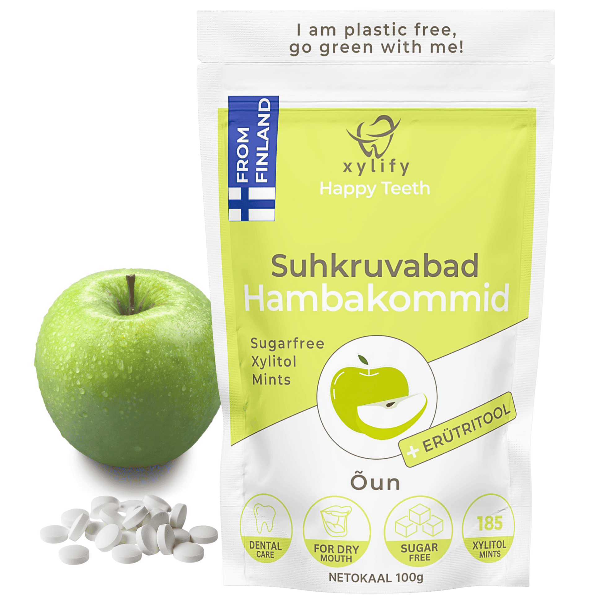 Happy Teeth ksülitooli ja erütritooliga hambakommid - Õun 100g / 185tk